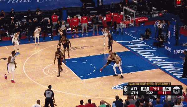 西蒙斯转身篮下,空篮不上选择了传球队友硬上,博得了犯规。